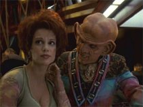 Chase: I feel very blessed about how Leeta evolved, from a hard-working Dabo girl, to the wife of the Grand Nagus. I think the writers make very Star Trek-like choices. Although Leeta started out very girlish and flirty in "Explorers", she has compassion for Rom and stood up for the union in "Bar Association". Then Leeta made a strong choice in leaving Dr. Bashir, the gorgeous British doctor, and falling in love with Rom, who was only pretty on the inside. The Trek writers love to have the "underdog" (American slang for least likely person) win, and I think that's something we can all relate to.