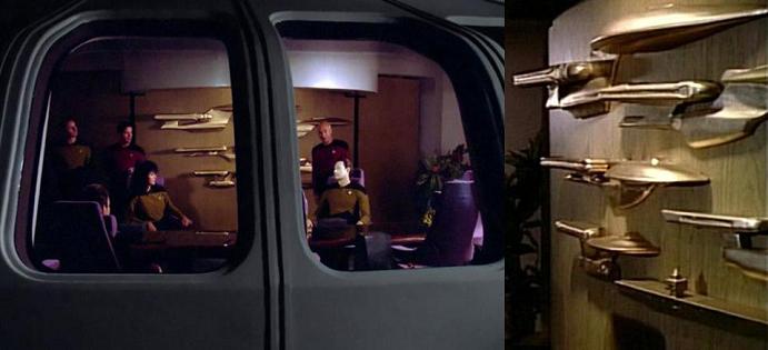 גם על ה-NCC-1701-D ב"הדור הבא" ניתן לראות תצוגה דומה בחדר הישיבות של הצוות. התצוגה כוללת את ספינות החלל שקדמו לה בעבר, כולל ספינותיו של קירק, לצד נושאת מטוסים: