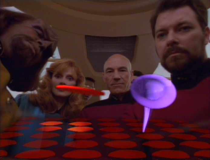 למי שלא ראה – מדובר בפרק שבו קומנדר רייקר חוזר לסיפון האנטרפרייז אחרי ביקור ברייזה ובאמתחתו מספר עותקים של משחק שקיבל מ"ידידה" קט
