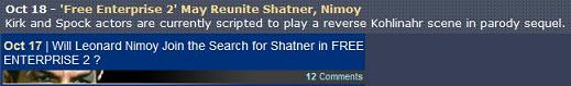הראיון שערכנו ערב פסטיבל "אייקון 2005" עם הבמאי רוברט ברנט ובו סיפר פרטים אודות התסריט החדש שכתב עבור Free Enterprise 2, גררו תגובות חיוביות של ציפיה בעולם מעריצי "מסע בין כוכבים". החדשות על-פיהן התסריט מפגיש את לאונרד נימוי עם וויליאם שאטנר אף פורסמו באתרי חדשות טרק בינלאומיים כמו TrekWeb ו-TrekToday, כציטוט מהראיון של סטארבייס972.