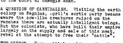 שאלה של קניבליזם. בביקור במושבת כדור הארץ ברגולוס מבינה משלחת הסיור של (קפטן) אפריל בהדרגה שהיצורים דמויי הפרות שמגדלים שם בחוות הם למעשה יצורים תבוניים. אבל אנשי המושבה, שבנו את האימפריה שלהם במידה רבה על אספקה ומכירה של הבשר הזה מתקוממים על הנסיון לשחרר את "בני הבקר" שלהם.